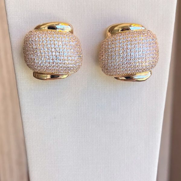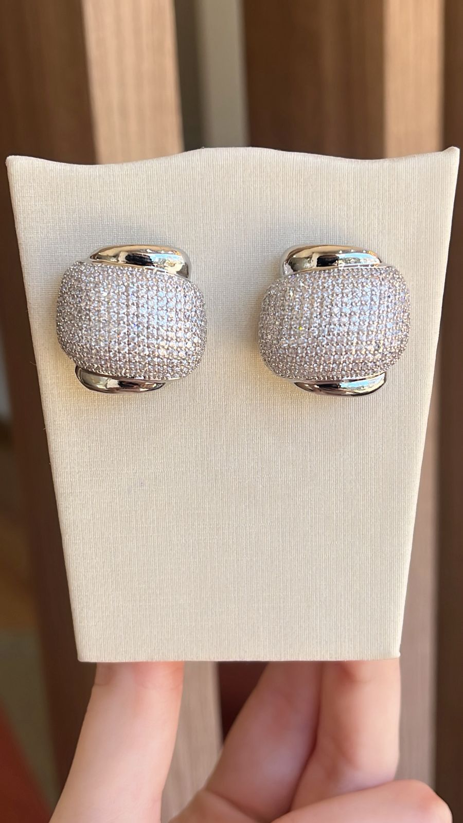 Brinco com design elegante, composto por parte lisa e detalhe cravejado em micro zircônias cristal, banhado a ouro branco com tarraxa. Peça de alta qualidade, ideal para revenda, com excelente aceitação no atacado. Versátil, atende diferentes públicos e ocasiões, sendo uma ótima opção para compor mix de produtos maximalistas.